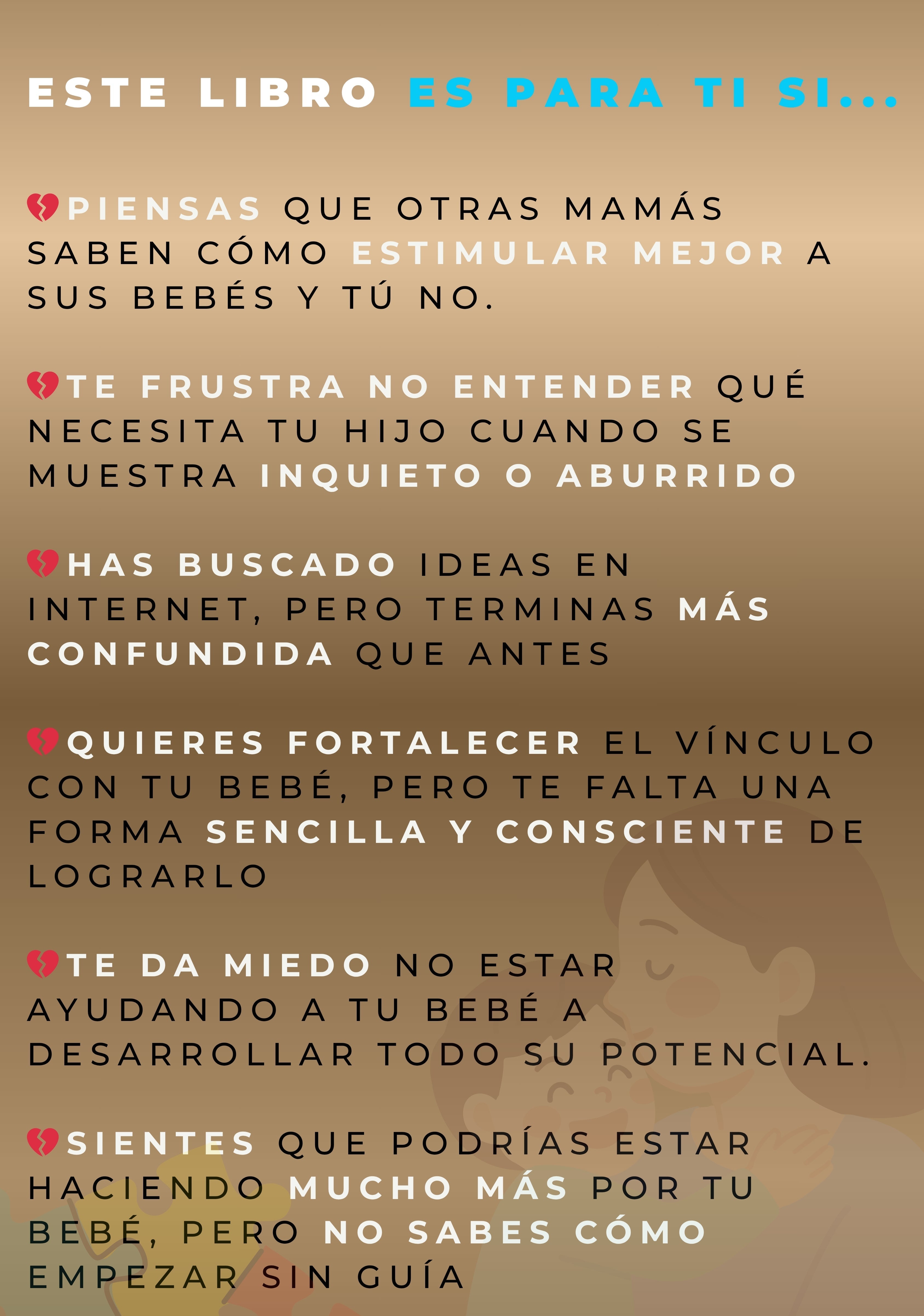 Perfecto. Este libro está pensado para mamás reales, no para profesoras de neurodesarrollo. Cada actividad está explicada paso a paso, incluso te diré qué hacer, cómo hacerlo y en qué fijarte para saber si tu bebé está disfrutando y aprendiendo.