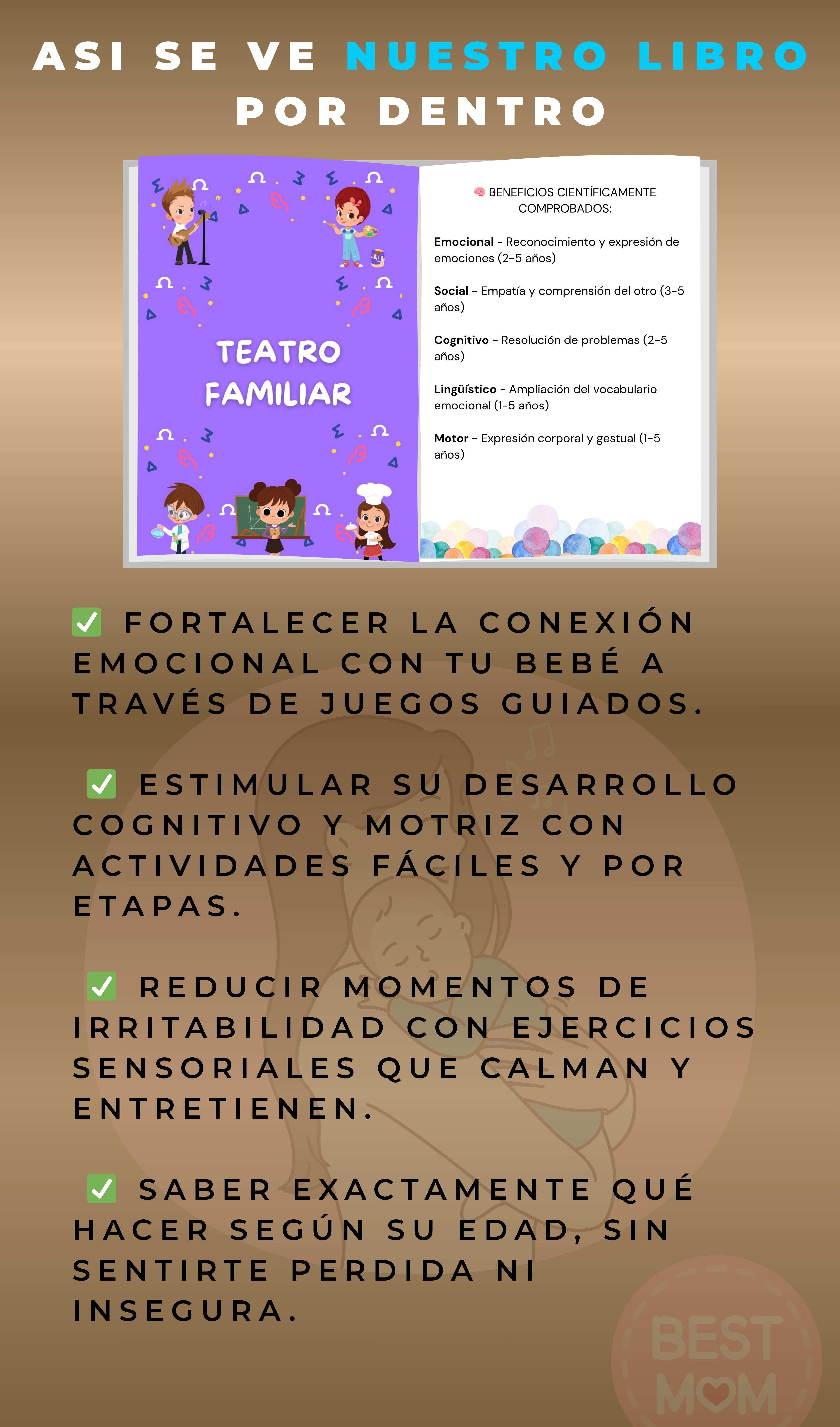 Sí. Incluye actividades adaptadas por edad, para que no tengas que adivinar qué hacer a los 6, 12 o 24 meses. El libro crece con tu bebé. Es como tener una brújula de desarrollo en tu bolsillo.